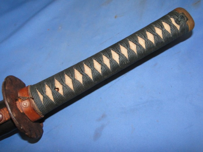 The handle is wrapped in the rebellion style. There is no Menuki found. Blue color cloth with a fairly plain