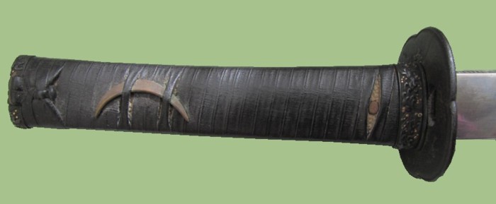 The handle is very tightly wrapped. The Menuki is in the shape of a half moon and it is attached externally.