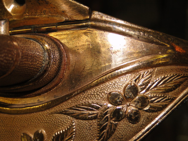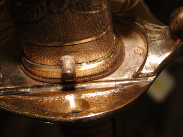 The scabbard is made of Black leather. The scabbard is adorned with three metal fittings. One at the top which has the suspension ring.
