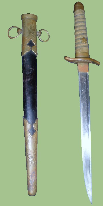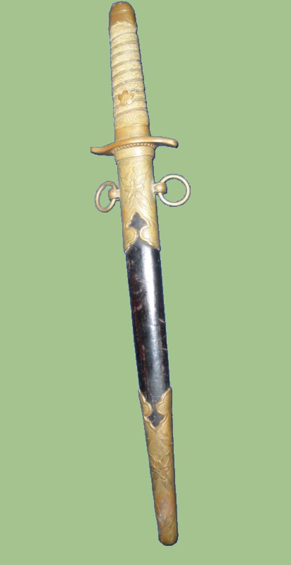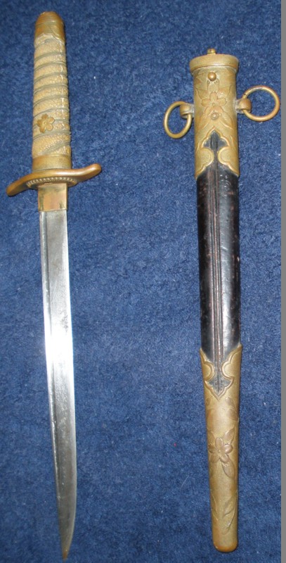 This is a WWII Japanese imperial navy dagger. This was the standard issue. Not the best quality. Machine made blade.