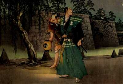 The next print shows two samurai walking on a street at night. A sound appears to catch the attention