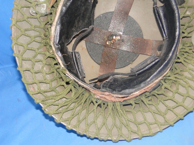 This is a WWII British army helmet. Of steel construction. Complete with a cotton green net. canvis chin straps are attached