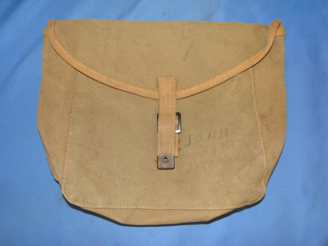 Of khaki color canvis. The edges are enforced with heavy duty cotton. The inside of the main flap is stamped with the words;