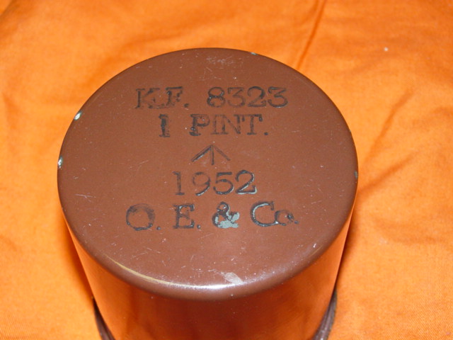This is a British field cup. As issued during the Korean war as part of the personal gear carried by a soldier. The bottom of the cup is dated 1952 and shows the broad arrow. manufactured by the O.E. & company.