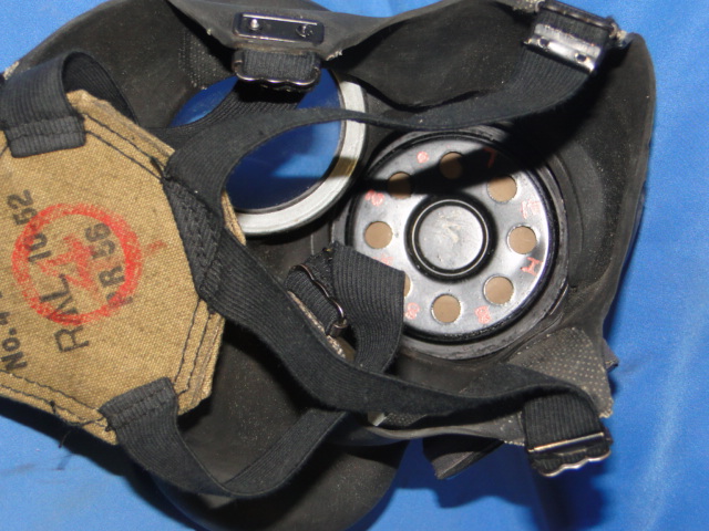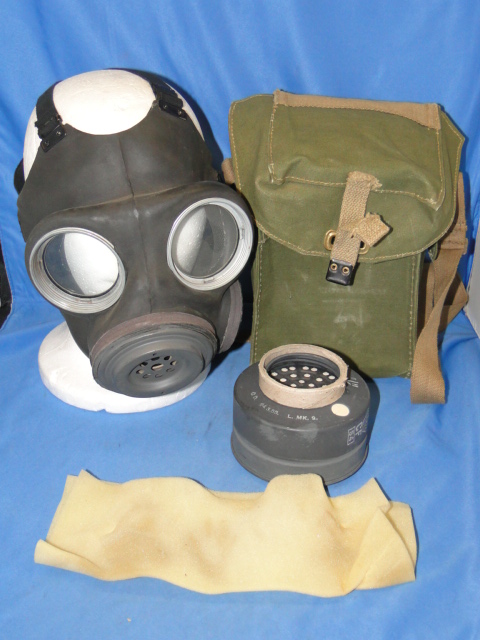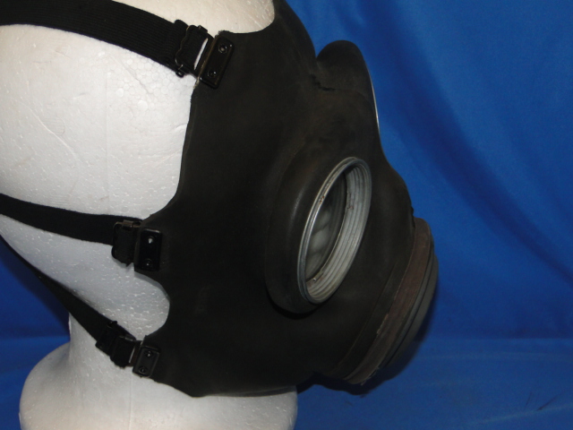 This is a British gas mask. As issued to soldiers during WWII. The design of the mask is very standard. The main body is made of
