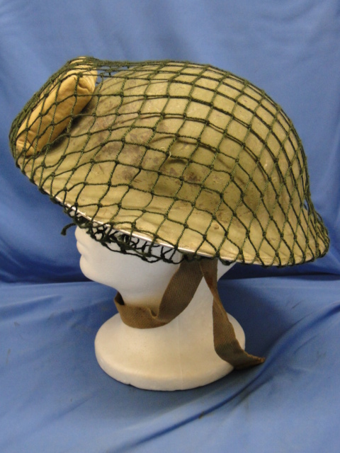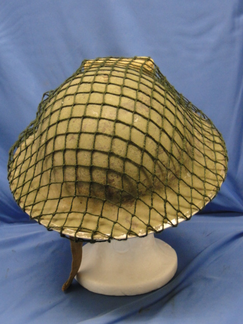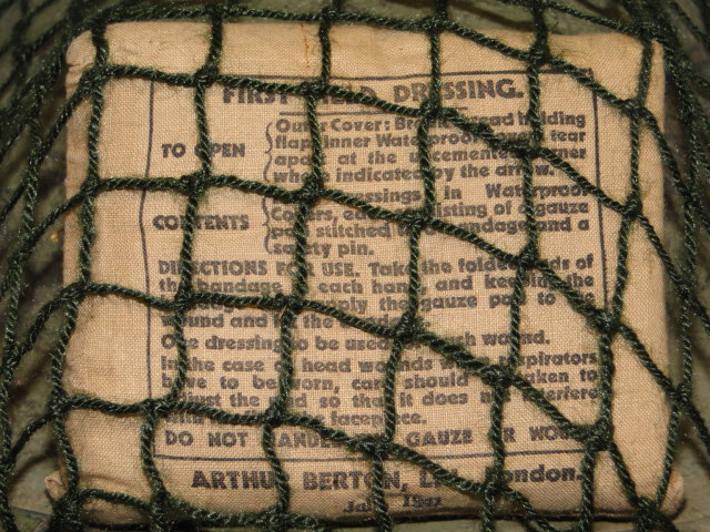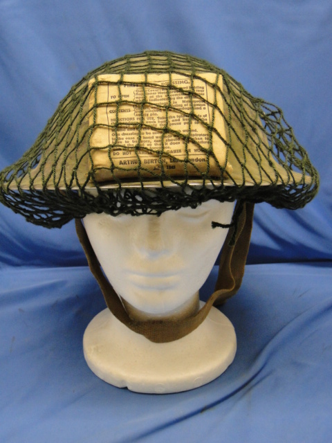 This is a WWII British army helmet. Complete with a cotton net which holds in place a first aid bandage. It was a common