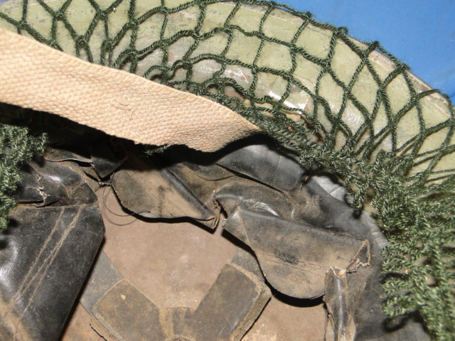 Complete with a khaki canvis chin strap. Each end is attached to the side of the helmet. A black leather sweatband covers the