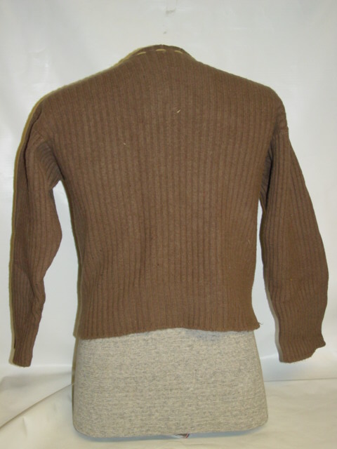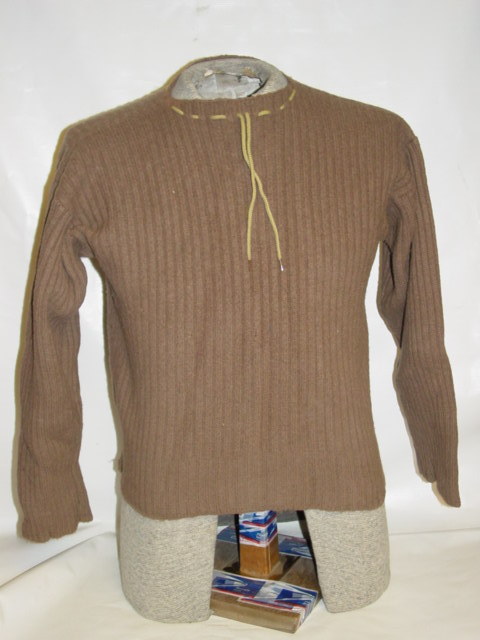This is a British army sweater. As used during WWII. Of wool construction. Long sleeves with a tie around the neck to secure it closed. Dark Brown color.