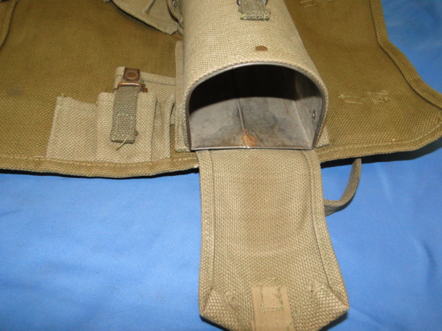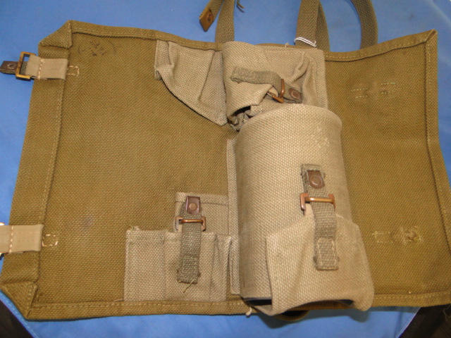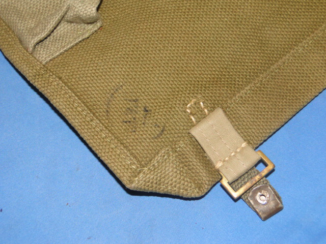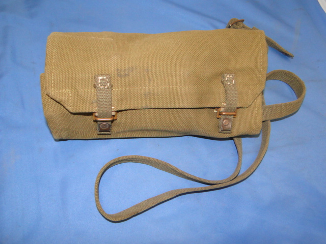 Of rectangular shape. The pouch was made of Khaki canvis. Two straps secured the main flap in the closed position. A shoulder