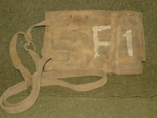 When the bag is opened it reveals a series of four different compartments. This is where the parts were housed. The back of the bag has a marking painted in white which reads F1. Every strap is capped with a flat brass piece. This bag was issued to British army personnel during WWII.