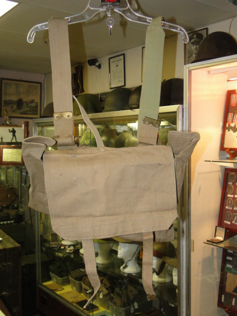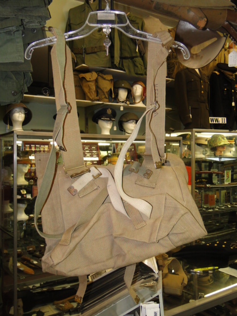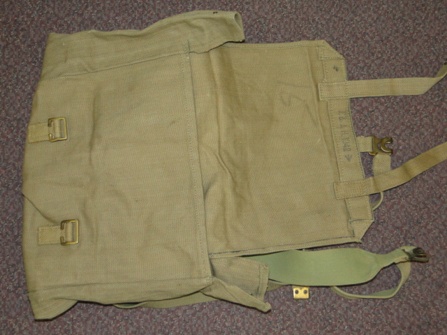 Of canvis construction. Khaki color. The pack had a series of brass fittings that controlled the length of the shoulder straps